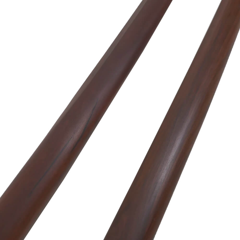 「イスの木」に現れる焦げ茶色の堅くて重い芯部の木材で、近年、希少化が進 んでおり、やがては手に入らなくなると言われています。 非常に強度・重量に優れ、硬度や重量においては国産木材の中では1番ですが、粘りがないため、割れたり折れたりしやすく、打ち合いや実戦中心の稽古には不向きです。その高級感漂う重量 感と美しい木目は鑑賞用や贈答用の木刀としても非常に人気があります。
